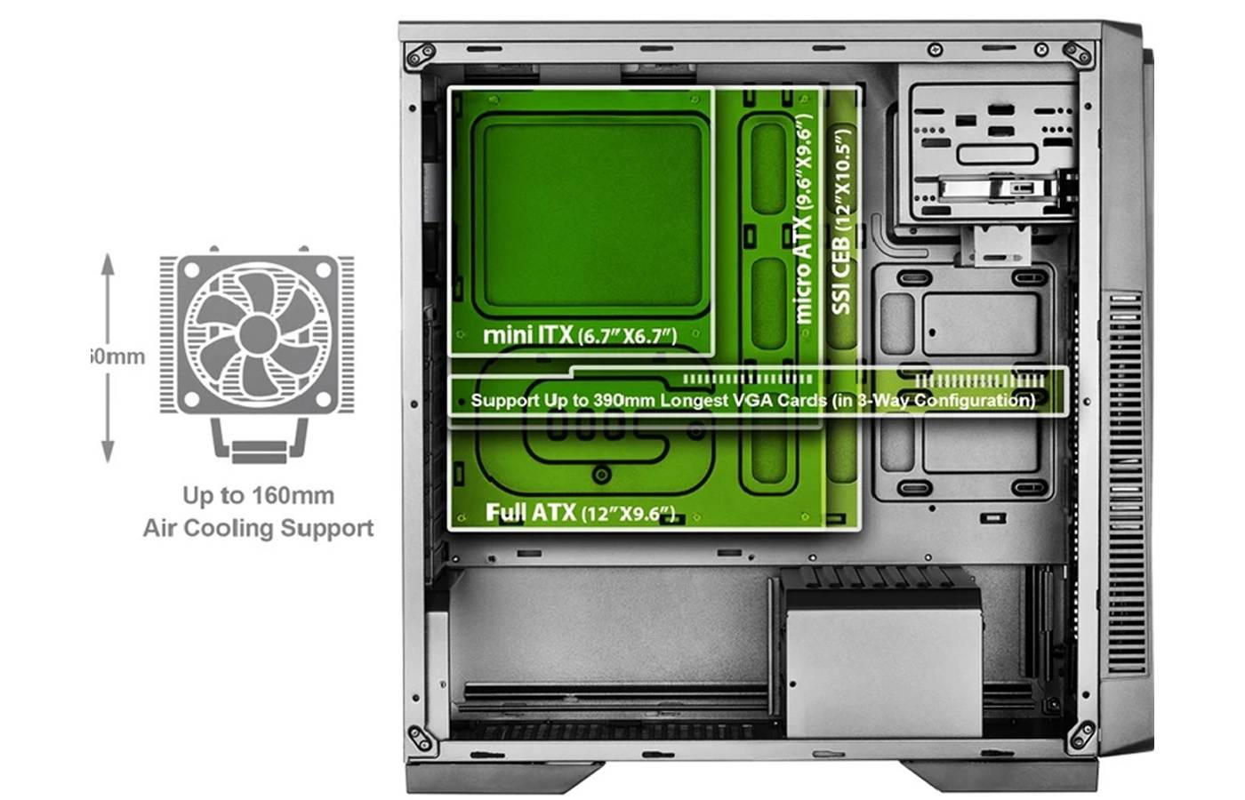 کیس کامپیوتر گرین مدل PARSA در ردهی Mid Tower طراحی شده و ابعاد آن ۴۷۰×۱۸۰×۴۵۰ میلیمتر است. وزن ۵.۷ کیلوگرم با بدنهی تمامفلزی، محصول را به گزینهای مقاوم و مناسب برای کاربریهای خانگی، اداری و نیمهحرفهای تبدیل کرده است. فضای داخلی بهاندازهای است که کارت گرافیکهای با طول حداکثر ۳۹۰ میلیمتر، کولر پردازنده تا ارتفاع ۱۶۰ میلیمتر و پاورهای تا طول ۲۳۰ میلیمتر بدون مشکل نصب شوند. این تعادل باعث میشود هم نصب قطعات بزرگ ممکن باشد، هم مدیریت چیدمان در میز یا اتاق آسان بماند.